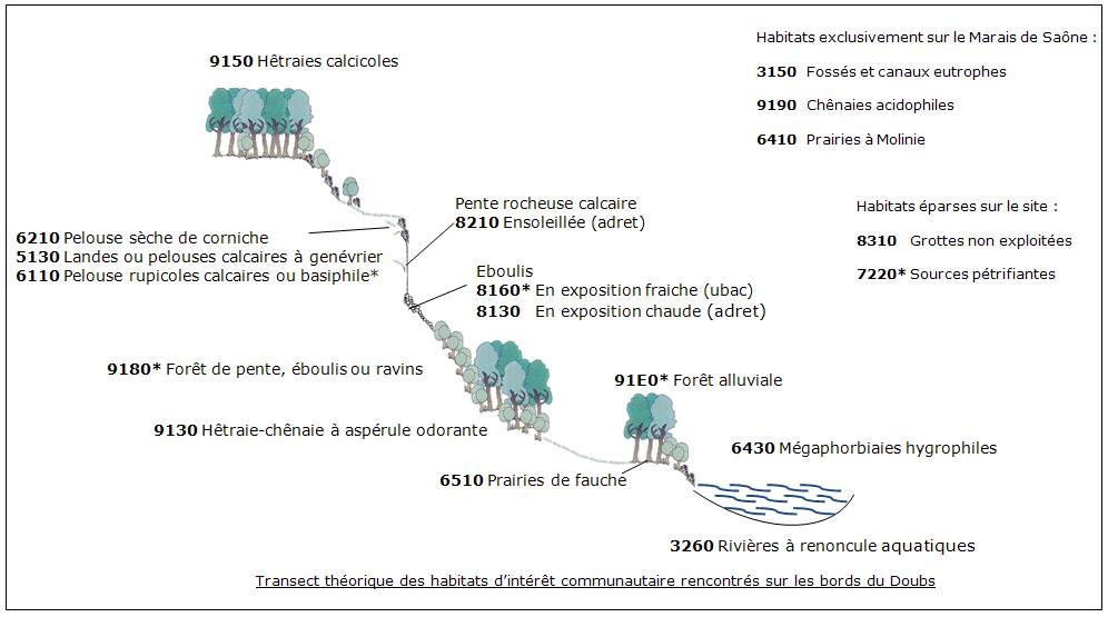 La Moyenne Vallée du Doubs possède une grande variété de milieux et compte 18 habitats retenus d’intérêt communautaire (européen) (ils sont listés par l'Union européenne par un nom scientifique et un code à 4 chiffres). Le schéma ci-contre expose la localisation théorique de ces habitats sur le site (cliquer pour zoomer).