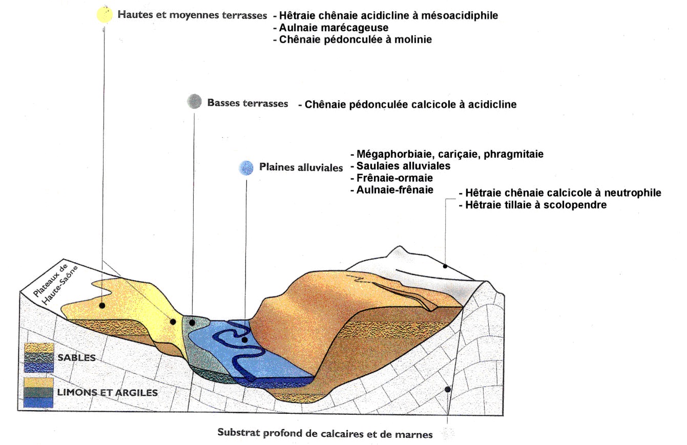 Des aulnaies* apparaissent dans les secteurs engorgés du lit inondable. Elles sont très localisées (Chaux-les-Port par exemple).