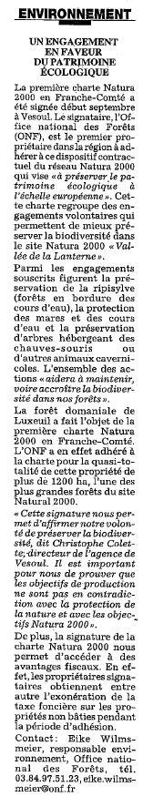 L'office National des Forêt a signé la première charte du site Natura 2000 "Vallée de la Lanterne" en engageant la quasi totalité de la forêt domaniale de Luxeuil-les-Bains, soit près de 1200 ha. (Article de l'Est Républicain du 15-09-2009)